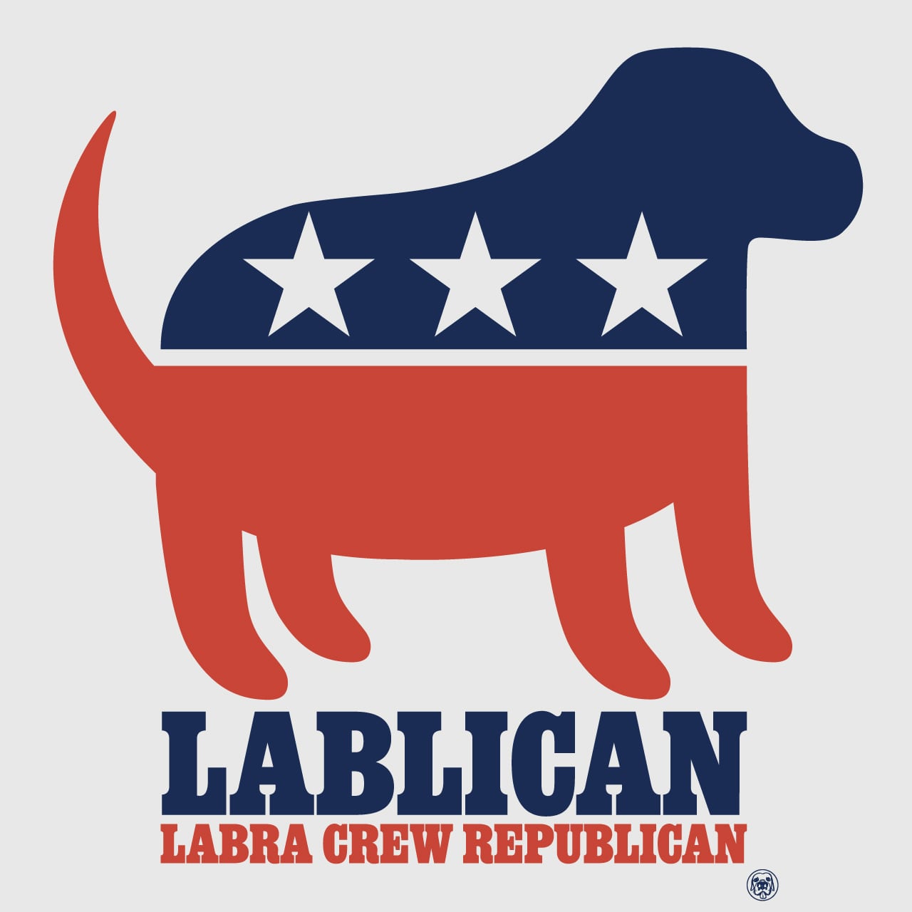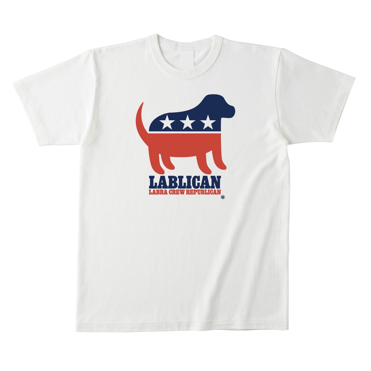 「アメリカ共和党の象」を連想させるレトロ配色で、ぶさかわラブラドールを大胆にプリントした“LABLICAN”ショートスリーブT。